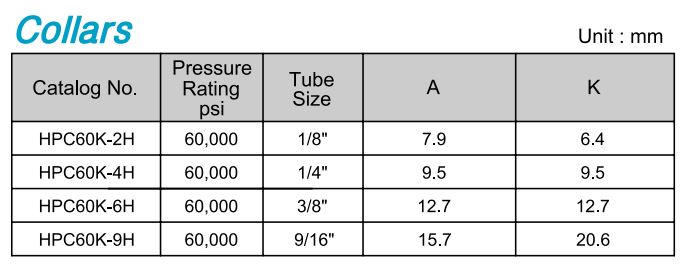 | 9/16" 60000 PSI Collar 316 Stainless Steel High Pressure Fitting | HPC60K-9H-S316 | Not In Stock | 3/6/2026 |